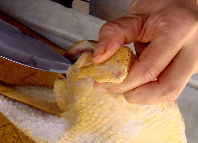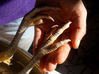 Para o caldo: pés, pontas de asa, pescoço, costela. Mais louro, alho, pimenta-do-reino, piment, salsinha. Imbatível! Miúdos do pato: moela, fígado, pulmões, testículos, traqueia e coração são aferventados no caldo, picados e voltam pra panela...