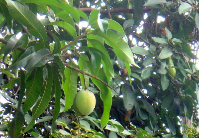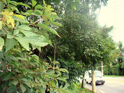 E, perto da minha casa, uma manga chupada no pé. Quem será que chega antes da gente? Piriquitos? Ampliando a foto, ainda vi um abacate na árvore vizinha (na foto, à direita).
